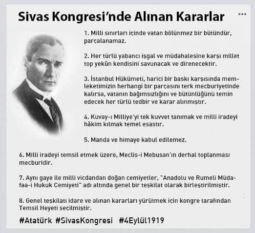 ”Ya İstiklal Ya Ölüm’ dediği, bağımsız, çağdaş Türkiye Cumhuriyeti’nin temellerinin atıldığı Sivas Kongresi’nin 103. yıl dönümünde, başta Gazi Mustafa Kemal Atatürk olmak üzere Kurtuluş Savaşı kahramanlarımıza minnetle, saygıyla, rahmetle…