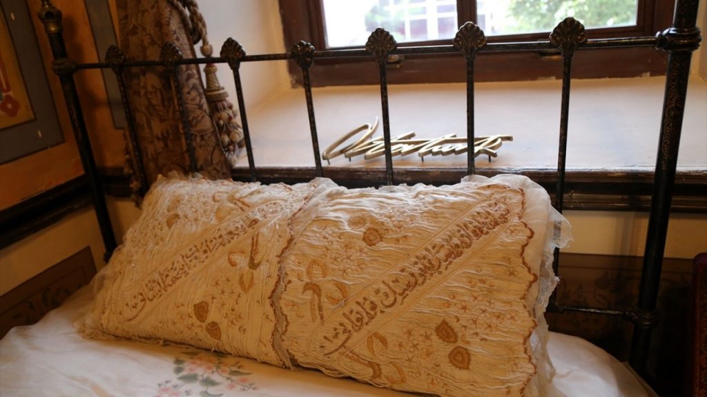 Mustafa Kemal’in dikkatini, yatağında iki baş yastığına işlenmiş iki dize çeker.