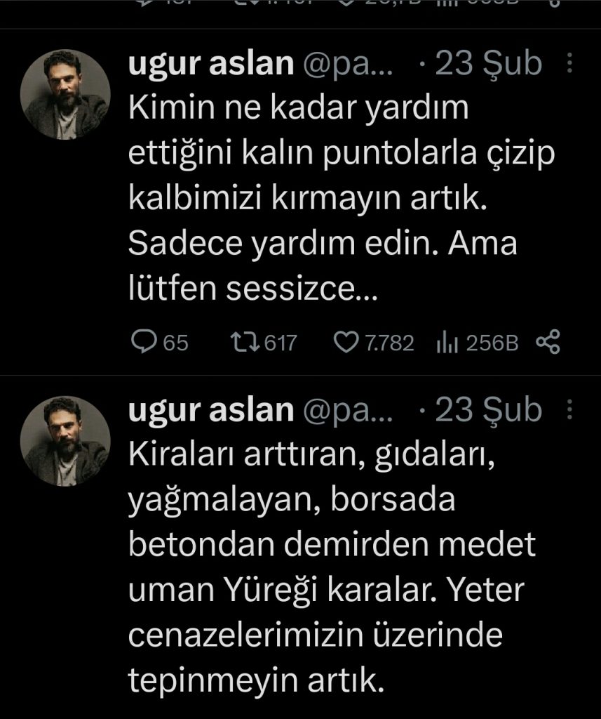 Uğur Arslan sosyal medya hesabından yaptığı paylaşımda, bölgedeki kira artışına ve yağmalamaya tepki gösterdi;