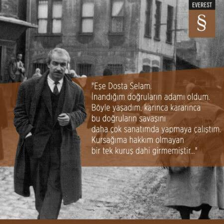 “Eşe dosta selam, İnandığım doğruların adamı oldum, böyle yaşadım, karınca kararınca bu doğruların savaşını daha çok sanatımda yapmaya çalıştım, kursağıma hakkım olmayan bir tek kuruş dahi girmemiştir.”