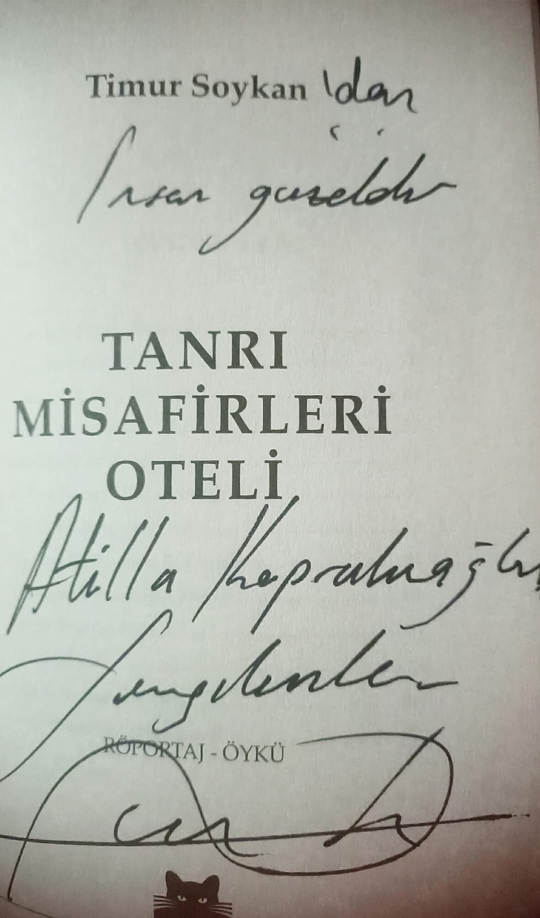 Kitabı “Tanrı Misafirleri Oteli”ni, “İnsan güzeldir. Atilla Köprülüoğlu’na saygılarımla.” diye imzalamış göndermiş meslektaşım Timur Soykan…